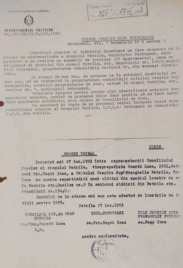 Schimbarea adresei din strada Republicii nr.130/2, Petrila, în strada Dacilor nr. 9, Petrila, s-a inițiat în 1982, dar s-a pus în executare doar în 17.03.1983, după cum reiese din procesul-verbal, pe care îl anexez alăturat: