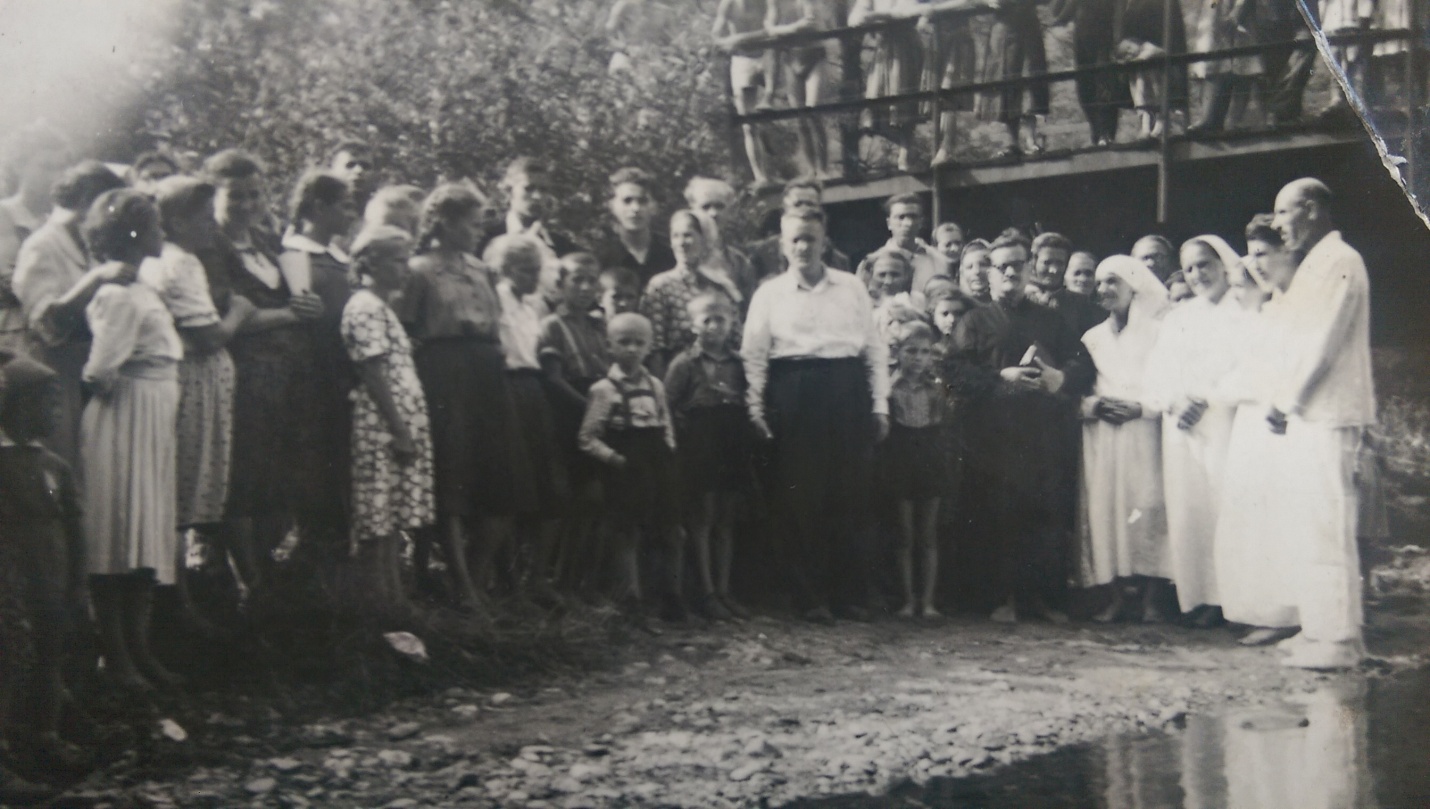 În această primă poză avem în faţă un botez, oficiat de către fratele Ștefănescu la podul 2, Petrila, în perioada anilor 1960. În poză sunt recunoscuți frații consemnați în arhivele bisericii.